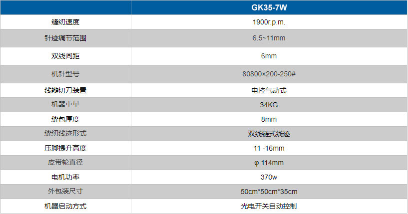 GK35-7W全自動雙針?biāo)木€高速封包機采用雙機針縫合,一次縫兩趟線,牢固可靠,可實現(xiàn)無泄漏封包,適合于對縫口有嚴(yán)格要求的廠家對紙袋、塑編袋、布袋等的封包縫口。采用 光電開關(guān)自動控制啟停機、電控氣動式切刀自動剪切線辮,適合于自動化程度較高的化工廠、倉庫、碼頭等流水線縫包。